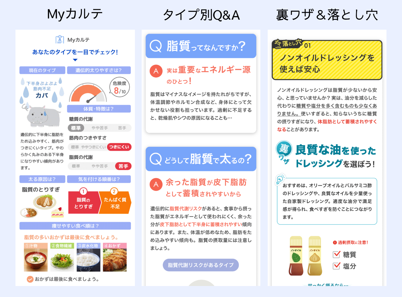 直感的に自分の体質タイプを把握できるレポートです。遺伝的な太りやすさがゲージで表示され、気を付けるべき栄養素、推奨される食べ順などを一画面で確認できます。自分の体質の要点をひとめで把握できる設計です。② タイプ別Q&A:「そもそも脂質ってなんですか?」から答えます