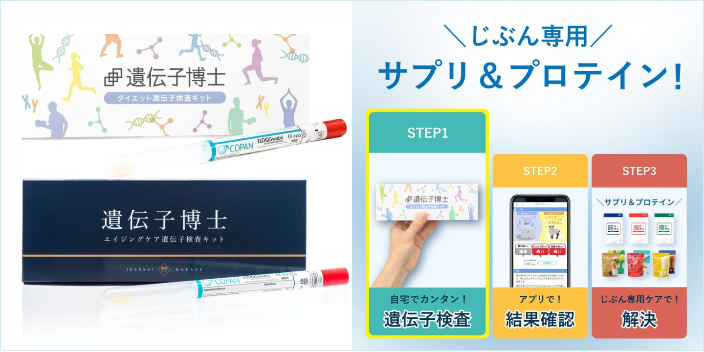 「遺伝子博士」は、自宅でできる簡単な遺伝子検査サービスです。検査結果に基づき、その人の体質に合った食事・運動アドバイスを提供。肥満遺伝子を調べる「遺伝子博士ダイエット」、老化遺伝子を調べる「遺伝子博士エイジングケア」を取り揃え、多くのお客様にご愛用いただいております。 また、遺伝子博士ダイエットでは体質をいくつかのタイプに分類し、各タイプにおすすめのサプリメントやプロテインを販売。パーソナライズされた健康習慣を始めやすい点も特徴的なサービスです。